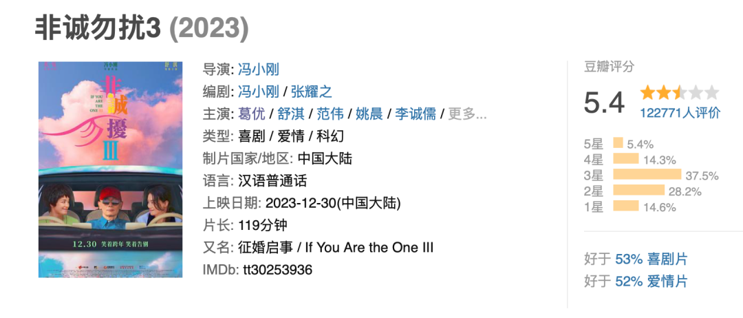 《非诚勿扰3》的豆瓣评分仅有5.4分