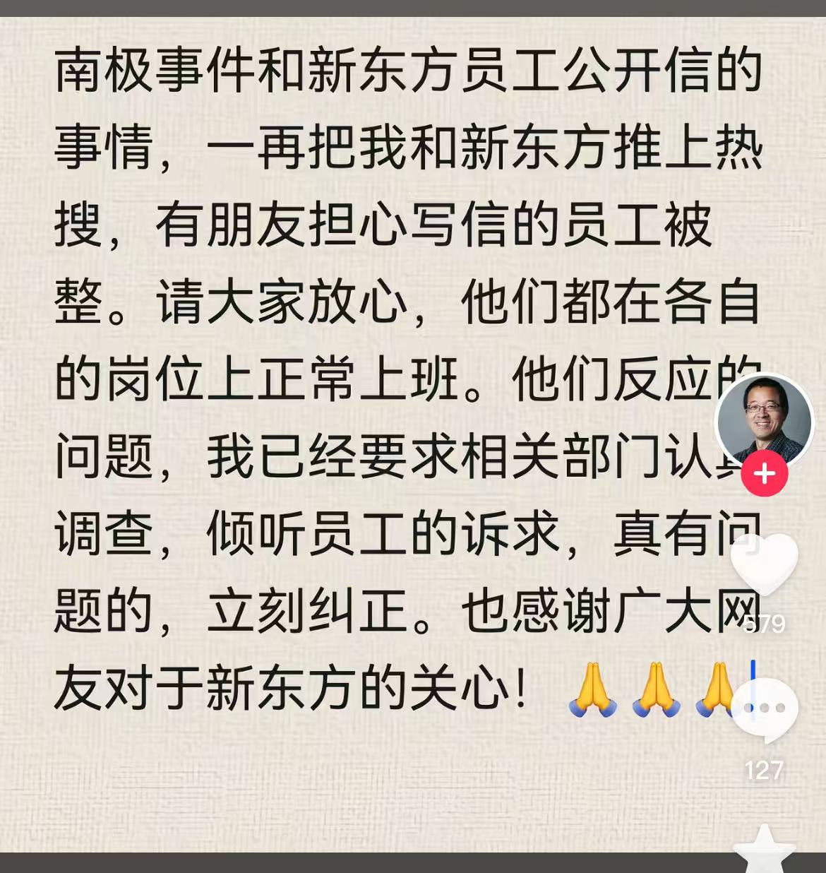 每经AI快讯,12月6日,新东方集团董事长俞敏洪发文称,南极事件和新东方员工公开信的事情,一再把我和新东方推上热搜,有朋友担心写信的员工被整。请大家放心,他们都在各自的岗位上正常上班。他们反应的问题,我已经要求相关部门认调查,倾听员工的诉求,真有心题的,立刻纠正。