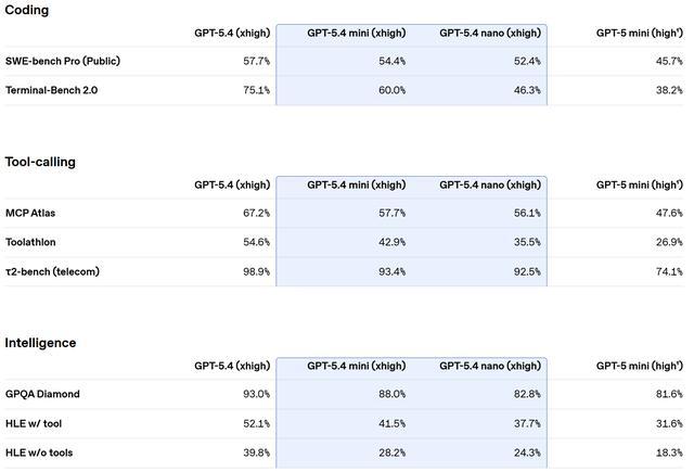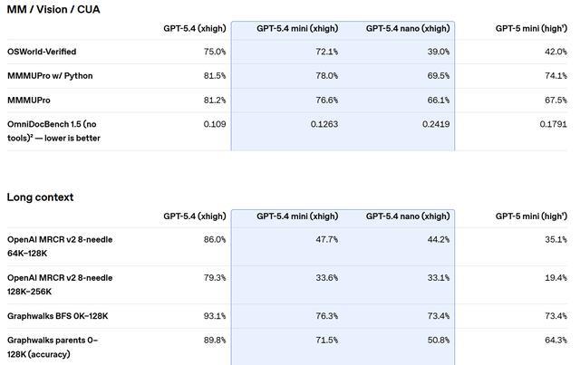 相比之下,GPT-5.4 nano 目前仅通过 API 提供,其输入与输出成本极低,分别为每百万 Token 0.20 美元和 1.25 美元。